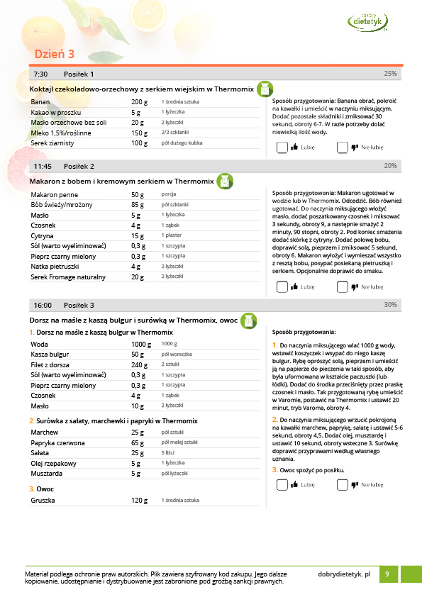Kompleksowy 30-dniowy program redukcyjny dla mężczyzn uwzględniający w przewadze dania na THERMOMIX. Program zawiera szczegółowy, 30-dniowy jadłospis na 1800kcal uwzględniający 4 posiłki w ciągu dnia. Program realizuje potrzeby odżywcze organizmu mężczyzn a także wymagania związane z najczęściej występującymi wymaganiami zdrowotnymi (regulacja ciśnienia krwi, wspomaganie pracy serca i układu krążenia, regulacja hormonalna). W opracowaniu tej diety uwzględniono dużą ilość posiłków na Thermomix co ma ułatwić stosowanie planu żywieniowego panom posiadającym tego typu urządzenie. Dania na Thermomix zamieszczone w tym opracowaniu nie zawierają typowych przepisów jakie można znaleźć w internecie. Są to dania specjalnie opracowane lub zmodyfikowane pod kątem diety redukcyjnej. Wszystkie porcje są również podawane w przeliczeniu na jedną osobę. Stosowanie tej diety nie tylko przyczyni się do szybkich efektów w redukcji masy ciała, ale także pozwoli poznać nowe, pyszne przepisy na Thermomix.