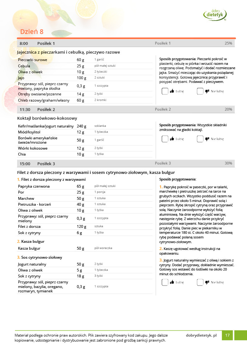 • w formie precyzyjnych jadłospisów wielodniowych (na każdy dzień miesiąca jest opracowany osobny jadłospis). Tutaj nie musisz zastanawiać się co zjeść każdego dnia, gdyż będziesz mieć dokładnie wszystko rozplanowane.