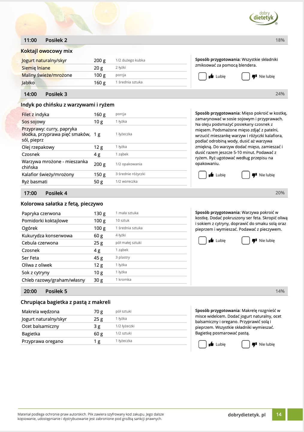 • w formie propozycji posiłków (zamiast pojedynczych jadłospisów jednodniowych, przygotowano propozycje kilku propozycji dań na każdy posiłek). Tutaj nie uzależniamy Cię od tego jakie masz np. w danym dniu zjeść śniadanie czy obiad, tylko sam wybierasz sobie ulubione danie z kilku przedstawionych przez nas propozycji.