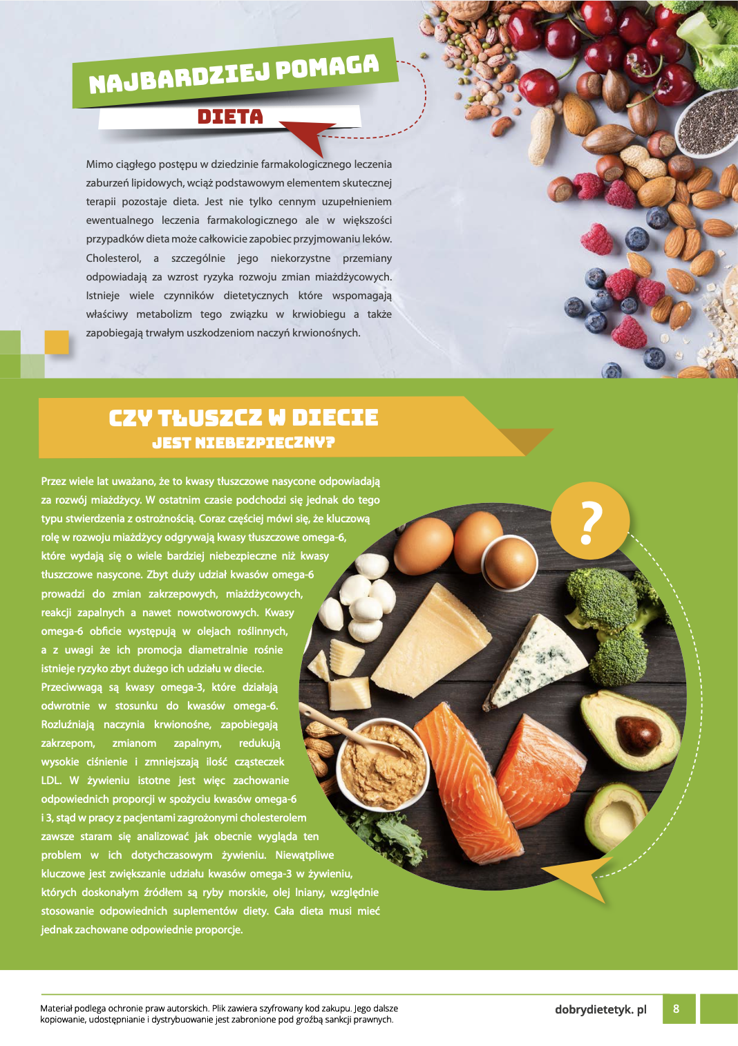Kompleksowy 30-dniowy program żywieniowy dla kobiet, który w naturalny sposób pomaga obniżać poziom cholesterolu we krwi. Specjalnie opracowana dieta dodatkowo redukuje zbędne kilogramy, normalizuje poziom cukru we krwi, wspomaga serce oraz aktywuje przemianę materii. W jej składzie zadbano w szczególności o dostarczenie odpowiednich składników wpływających na proces prawidłowych przemian cholesterolu i tłuszczów w organizmie a także składniki chroniące przez rozwojem zmian miażdżycowych w naczyniach krwionośnych. W diecie zwrócono uwagę m.in. na zachowanie odpowiednich proporcji w dowozie kwasów tłuszczowych, poziom cholesterolu pokarmowego a także dostarczenie witamin antyoksydacyjnych. Dieta idealna dla kobiet zbliżających się lub wchodzących w okres przekwitania.