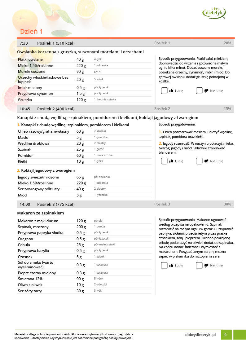 • w formie precyzyjnych jadłospisów wielodniowych (na każdy dzień miesiąca jest opracowany osobny jadłospis). Tutaj nie musisz zastanawiać się co zjeść każdego dnia, gdyż będziesz mieć dokładnie wszystko rozplanowane.